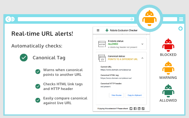 检查机器人.txt,meta机器人,带有URL警报的X机器人标签。规范警告,HTTP标头信息。 SEO扩展程序,机器人测试仪。