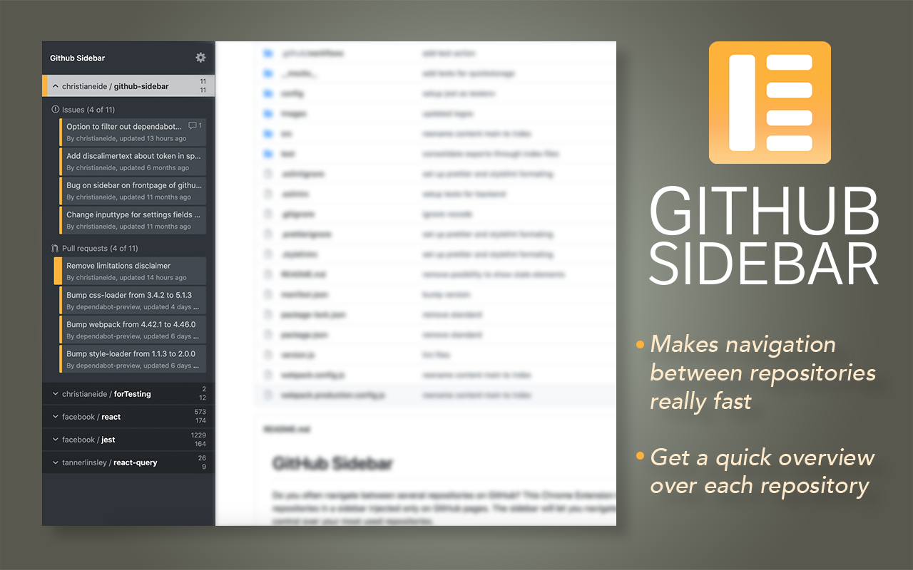 您是否经常在 GitHub 上的多个存储库之间切换?此 Chrome 扩展允许您在仅在 GitHub.com 页面上注入的侧边栏中为存储库添加书签。侧边栏可让您更快地导航并更好地控制最常用的存储库。