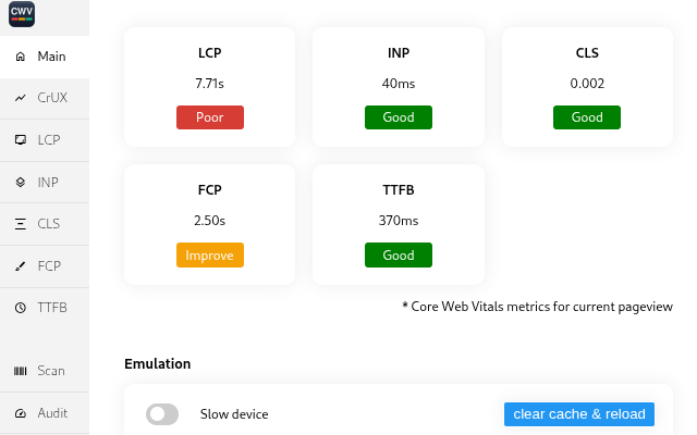 在任意页面上打开弹出窗口。立即查看您的 LCP、CLS、INP、FCP 和 TTFB 分数(以颜色编码)。没有单独的工具。不得将 URL 复制粘贴到 PageSpeed Insights 中。