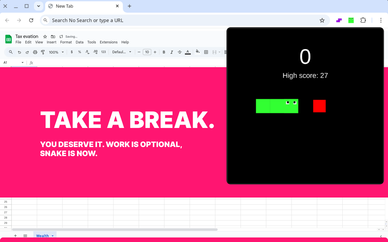 此扩展允许您(用户)随时随地玩贪吃蛇游戏,而无需打开新窗口。与许多其他选项不同,此扩展可以保存您的高分,这样当您要告诉所有朋友时,您不必只记住那个非常好的分数。 Snake 在更新时偶尔会显示升级的网站。 Snake 还可能在游戏窗口底部显示非侵入性横幅广告。