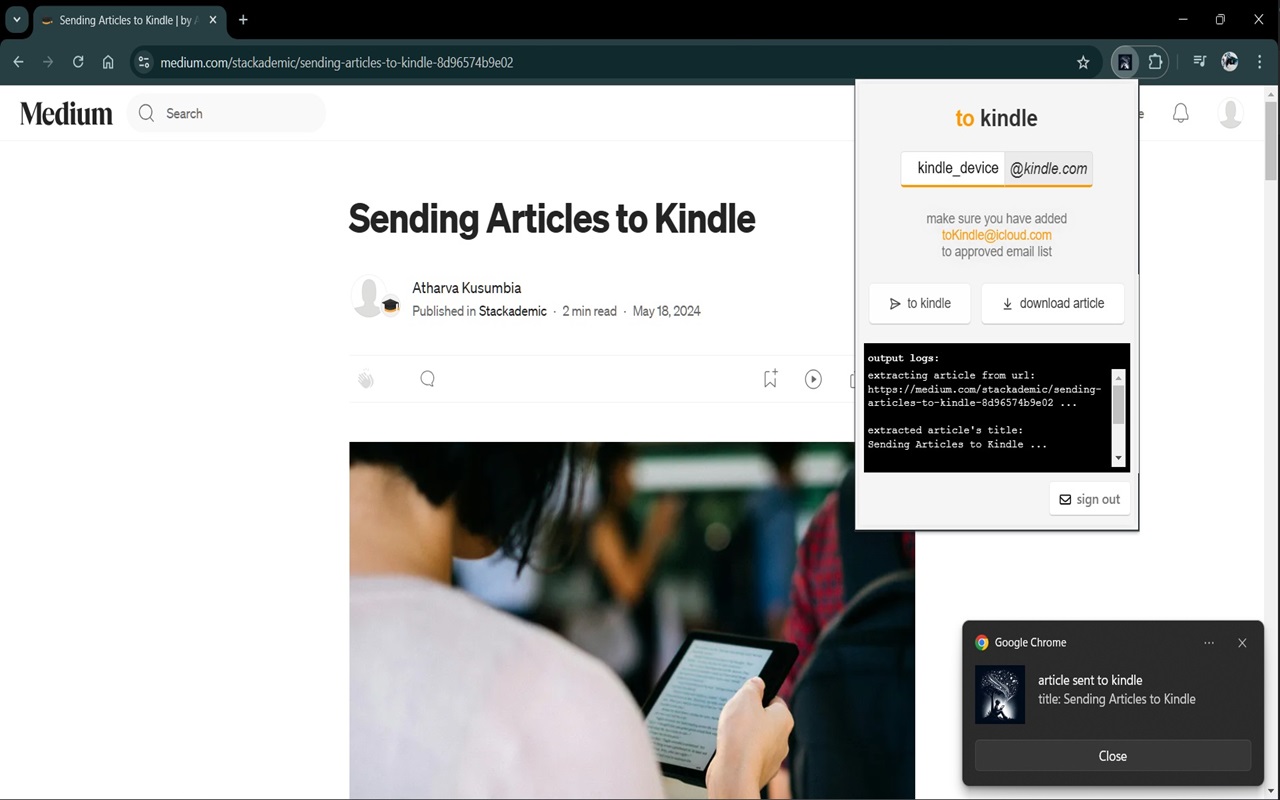 > 一键发送到 Kindle:通过我们的一键功能简化您的阅读工作流程。提取文章后,轻松将其发送到您的 Kindle。 To Kindle 负责格式化和转换,确保文章针对您的 Kindle 屏幕进行完美优化。它使用您的 Kindle 设备的电子邮件地址将文章发送到您的 Kindle
