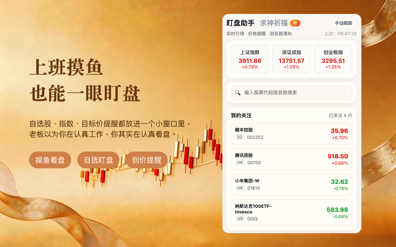 摸鱼也能快速看盘,愿你自选一直红。支持指数查看、股票关注、目标价提醒和浏览器通知,适合上班场景快速盯盘。