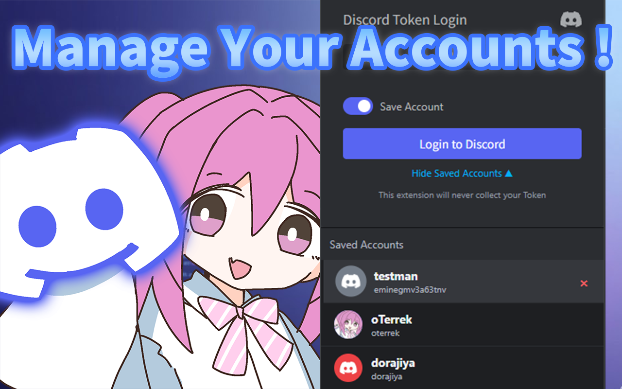 此扩展允许您使用访问令牌登录 Discord 并管理登录帐户。 ↓源码已上传至GitHub↓ https://github.com/taka-4602/Discord-Token-Login-Extension此扩展以吉祥物角色“Ozeu-Chan”作为其图标。 ↓更多关于“Ozeu-Chan”的内容↓ https://ozeu.net https://discord.ozeu.net