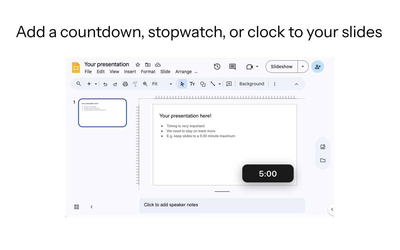 用于 Google 幻灯片演示文稿的实时计时器叠加,具有倒计时、秒表和挂钟模式。