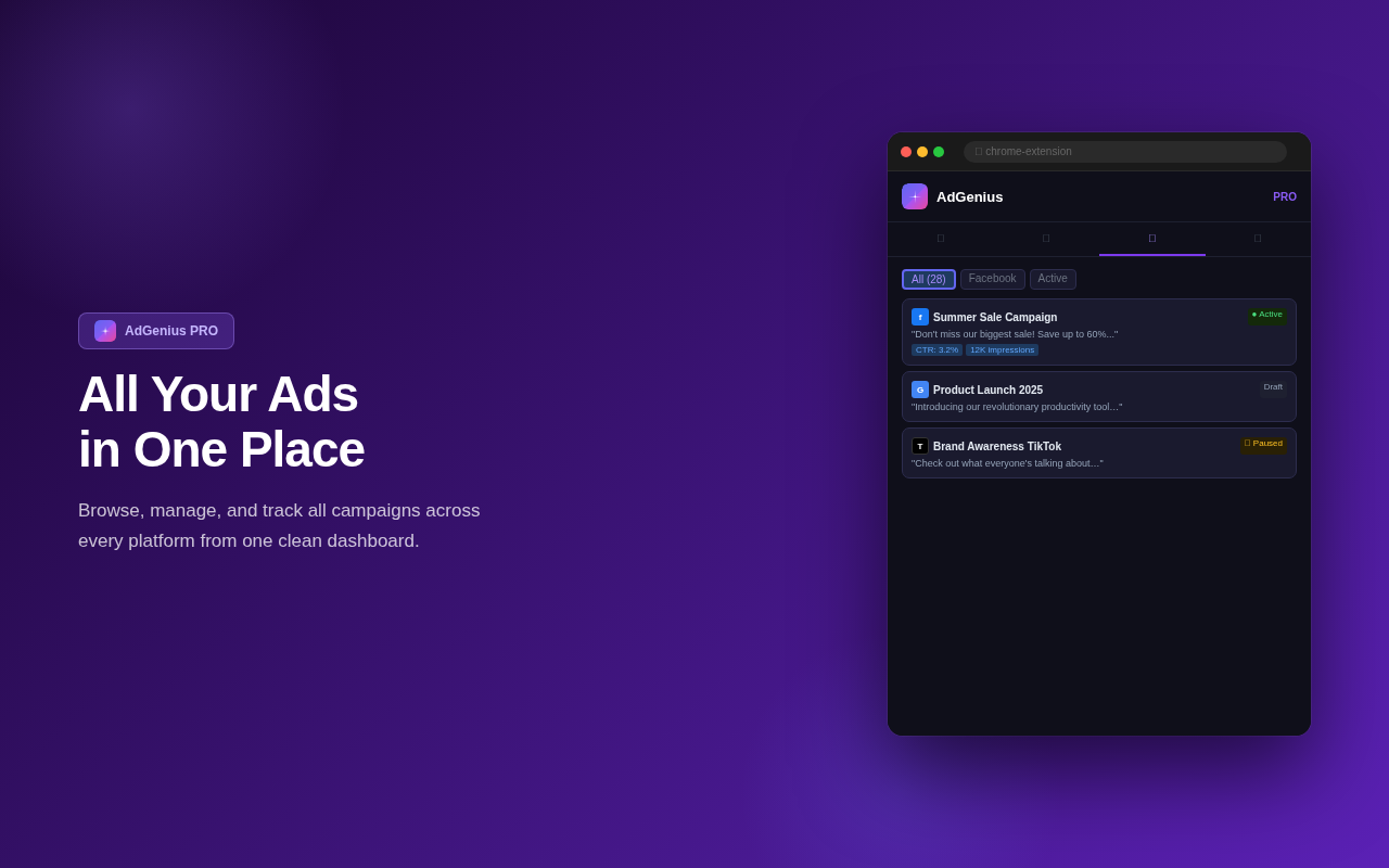 AdGenius 是一款强大的人工智能广告库扩展程序,可帮助营销人员、代理商和企业家保存、分析和生成高转化率的广告。