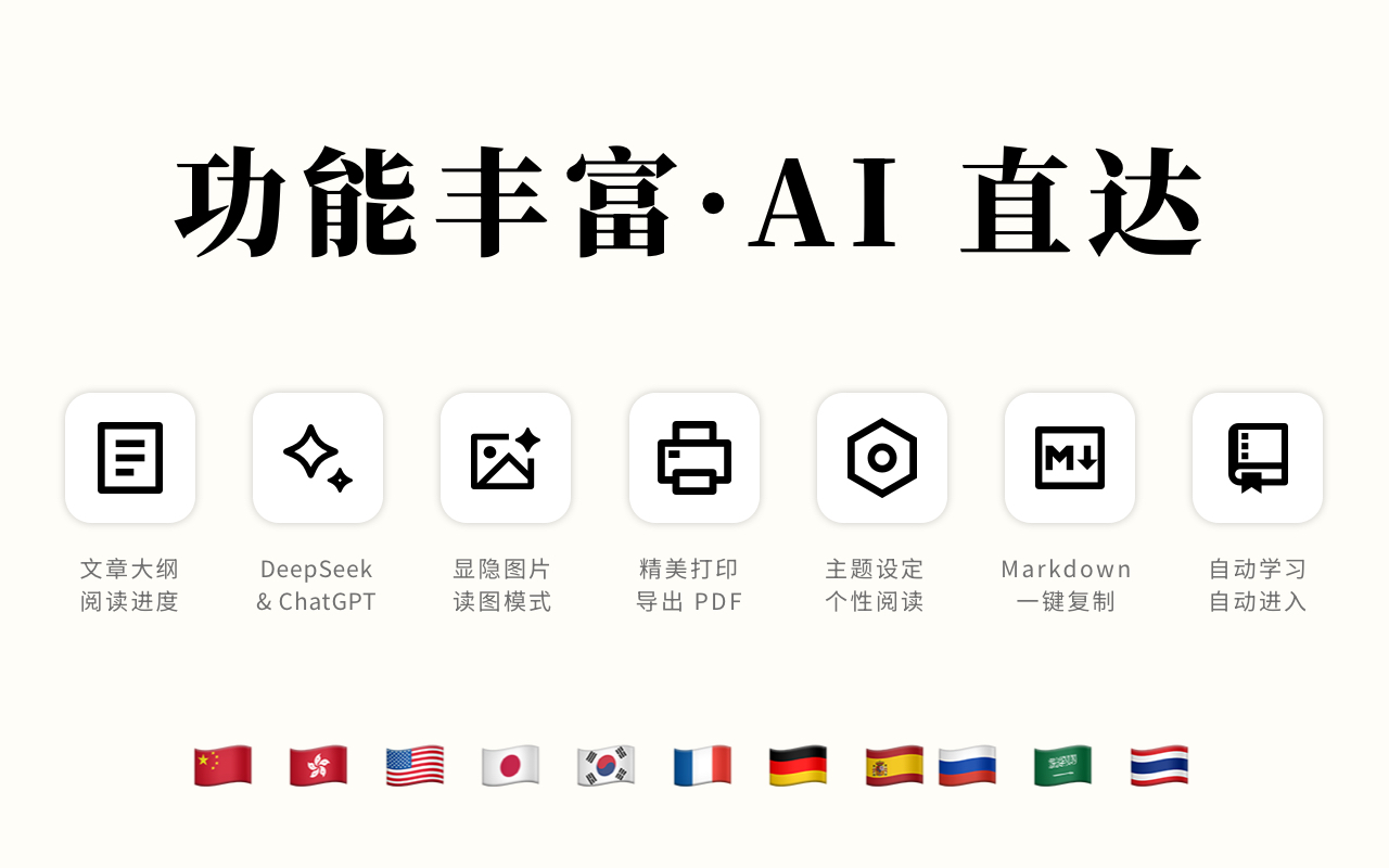 阅读本应是一种纯粹的享受。这款阅读模式(Reader Mode)插件为您一键提取网页正文,去除烦人的广告和弹窗,打造极致干净的沉浸式阅读环境。结合 DeepSeek/ChatGPT 的 AI 智能总结与多语言翻译能力,让您的知识获取更高效!