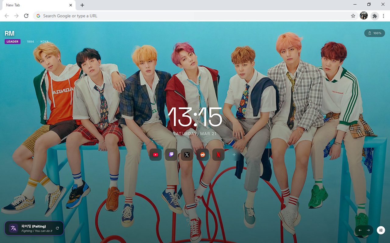 ✓ 韩语短语问候语:每当打开新标签时,下角就会出现一个随机的韩语短语,其中包含与 BTS 相关的粉丝最喜欢的表达方式,例如“Borahae(我紫色你)”、“Saranghae”和“Daebak”。