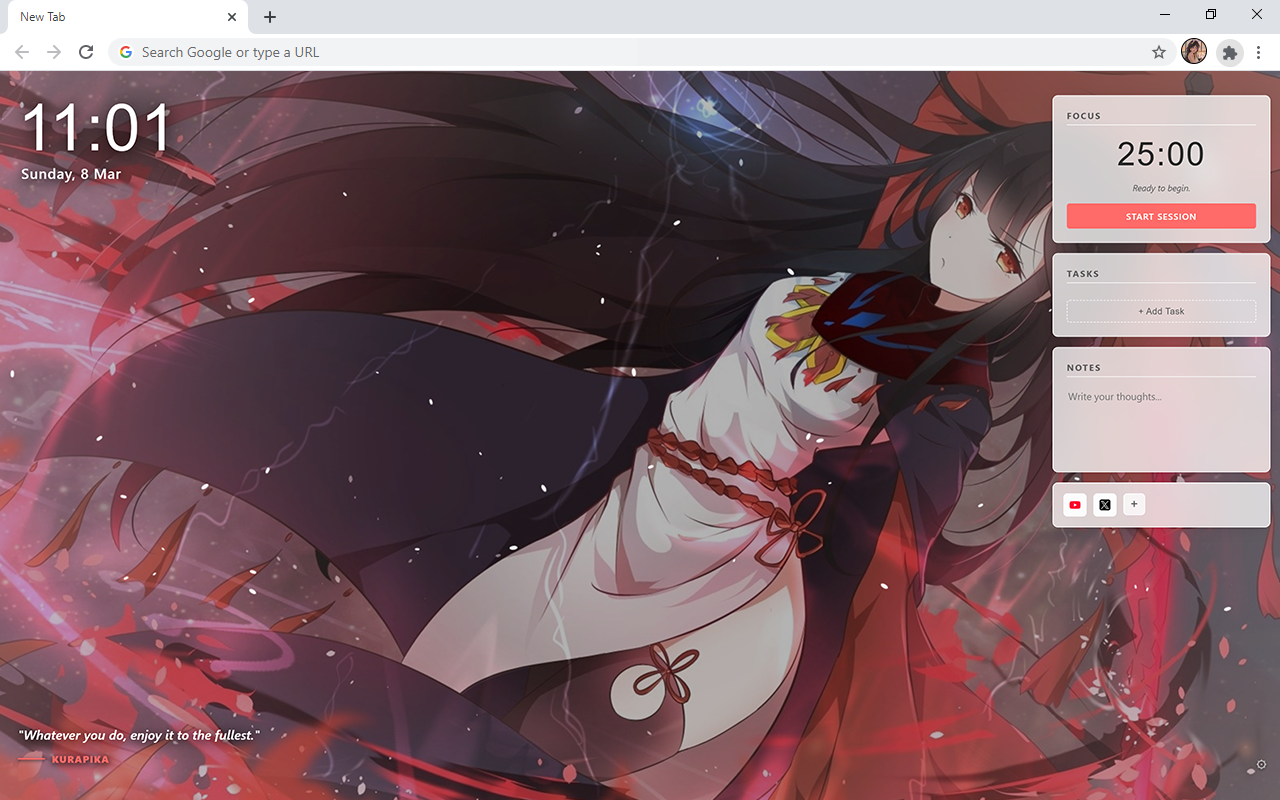 动漫可爱女孩高清壁纸新标签将您的浏览器变成一个美丽的动漫风格工作区,充满了令人惊叹的动漫壁纸和有用的生产力小部件。