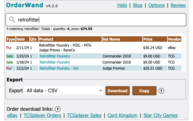 从 eBay、TCGplayer、Card Kingdom 等下载、导出和搜索您的订单历史记录。现在可以导出您的 TCGplayer 销量! OrderWand 将您所有的《Magic the Gathering》、《Pokemon》、《Flesh and Blood》订单下载到您的网络浏览器,并允许您将其导出到 Moxfield、Deckbox 和 JSON。