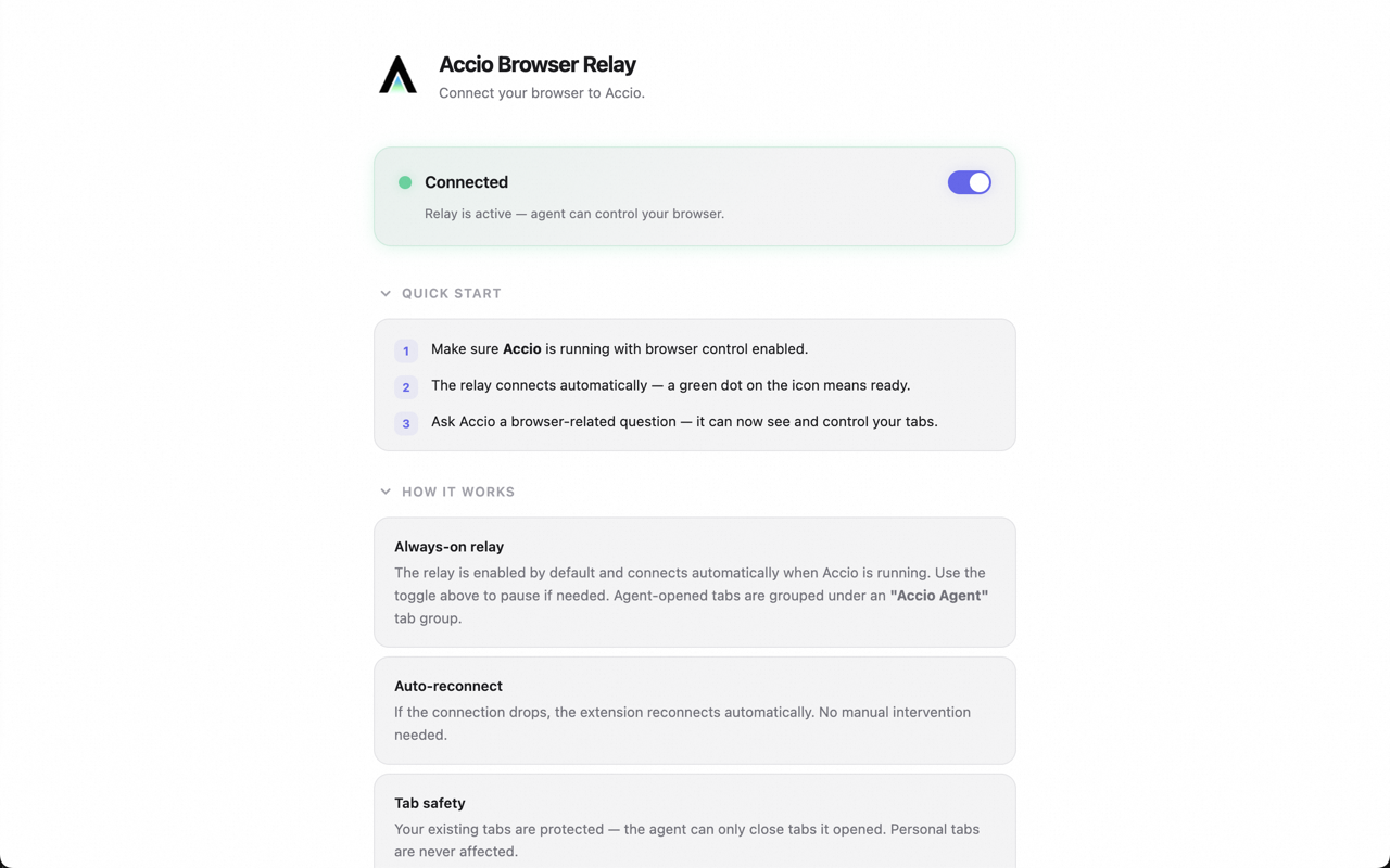 Accio Browser Relay 将 Accio 连接到您已打开的 Chrome 选项卡,允许代理通过本地浏览器中继(而不是单独的浏览器会话)检查页面并与之交互。