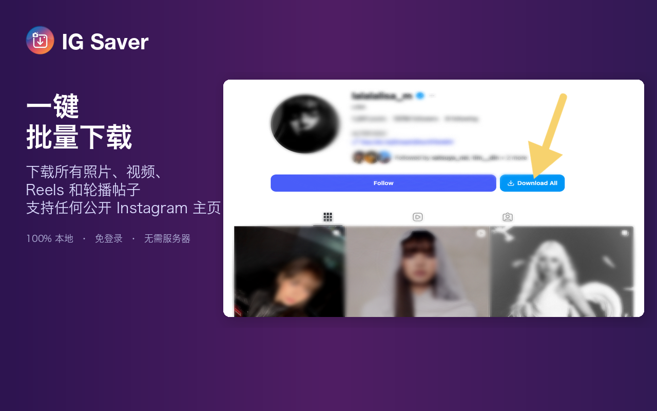 一键下载 Instagram 照片、视频、Reels、快拍和轮播帖子。完全免费、无广告、无需登录。