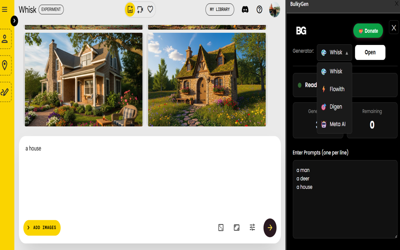 BulkyGen AI - 在 Google Whisk、Meta AI、Digen AI、Flowith AI、Grok AI 等上自动生成图像和视频。 Google Flow、Adobe Firefly 以及许多内容将在未来的更新中添加。注意:您可以编辑提示、重新生成特定图像并将它们全部下载到序列中的同一 ZIP 文件中(不会影响订单😉🔥) 1.2.0版本更新:错误修复
