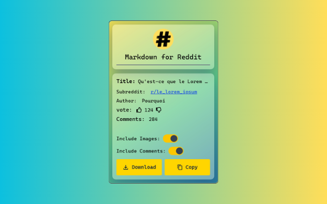 将任何 Reddit 帖子转换为干净的 Markdown 文件 - 带有可选的评论和图像切换。您只需一键复制或下载 .markdown 文件。