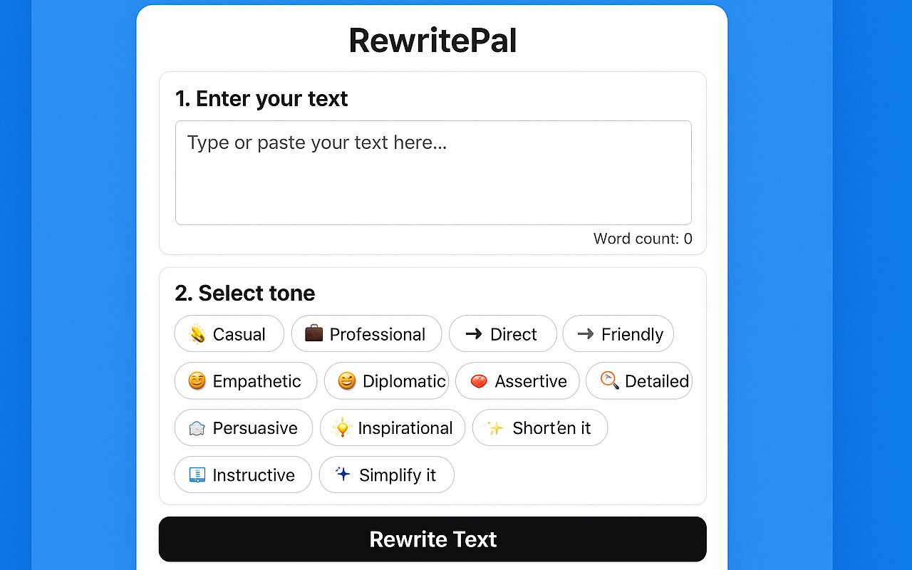 由人工智能驱动的文本重写工具,可立即以不同的语气(专业、休闲、友好等)增强您的写作。