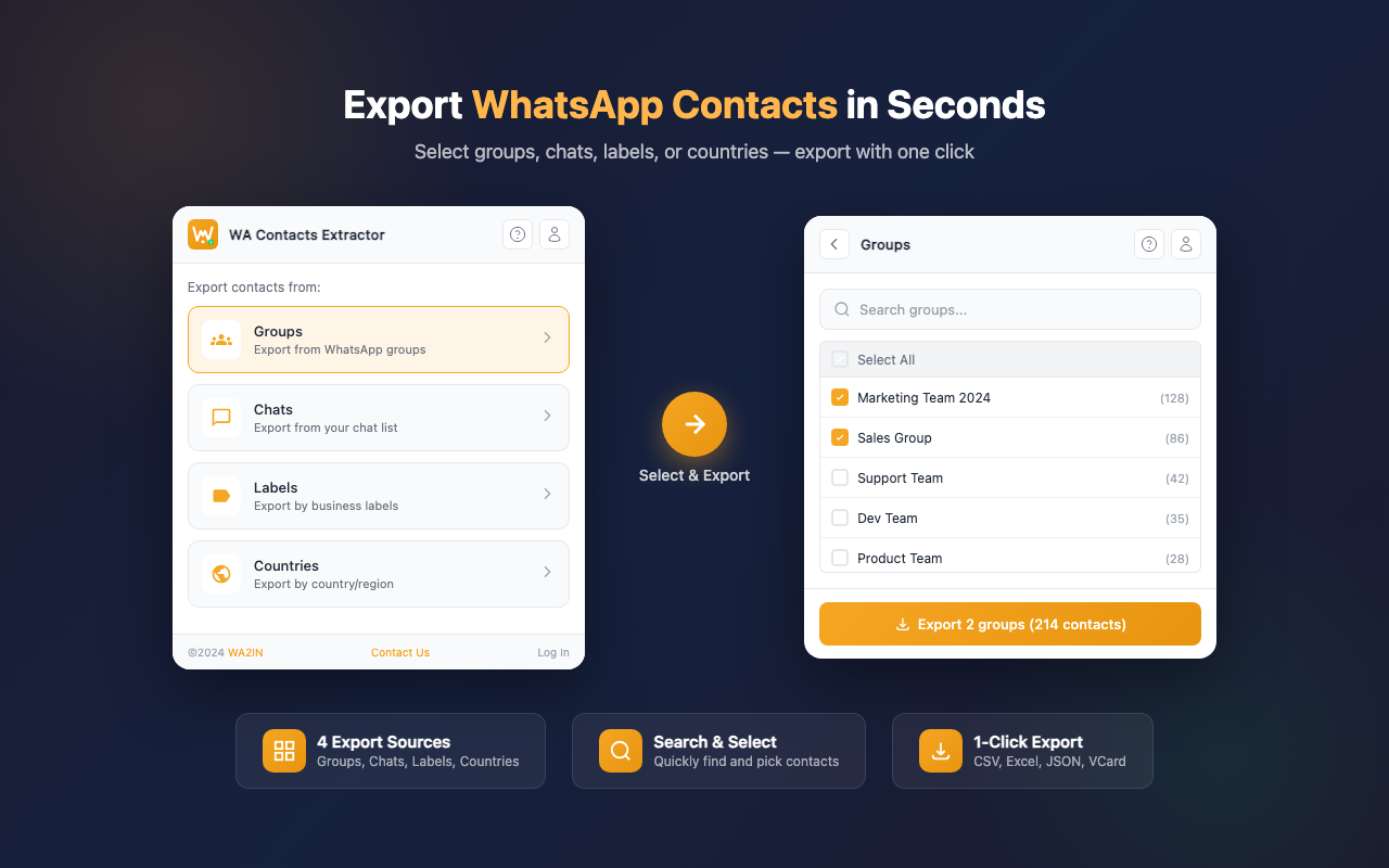 从WhatsApp群组、聊天和标签导出电话号码,将联系人下载为CSV、Excel、JSON或VCard文件——快速便捷。