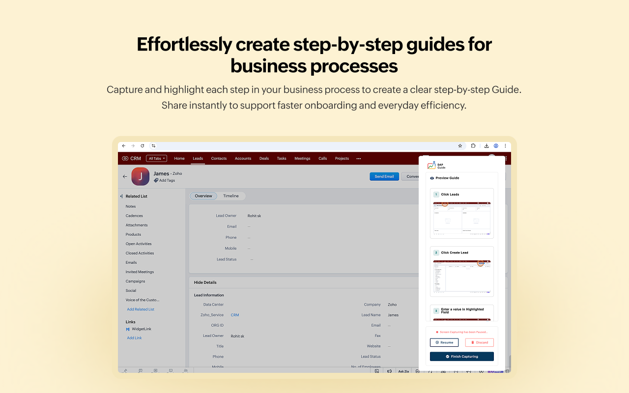 Zoho Digital Adoption Platform 是一种员工入职解决方案,使组织能够向每位员工提供清晰、一致且上下文相关的产品内指导。使用 Zoho DAP 扩展,创建: ⦿ 演练创建应用内流程来指导用户完成业务流程。 ⦿ 互动视频帮助用户在使用正式产品之前亲身体验关键工作流程。 ⦿ 指南轻松创建业务流程的分步指南如果您需要任何帮助或有疑问,请发送电子邮件至 support@zohodap.com