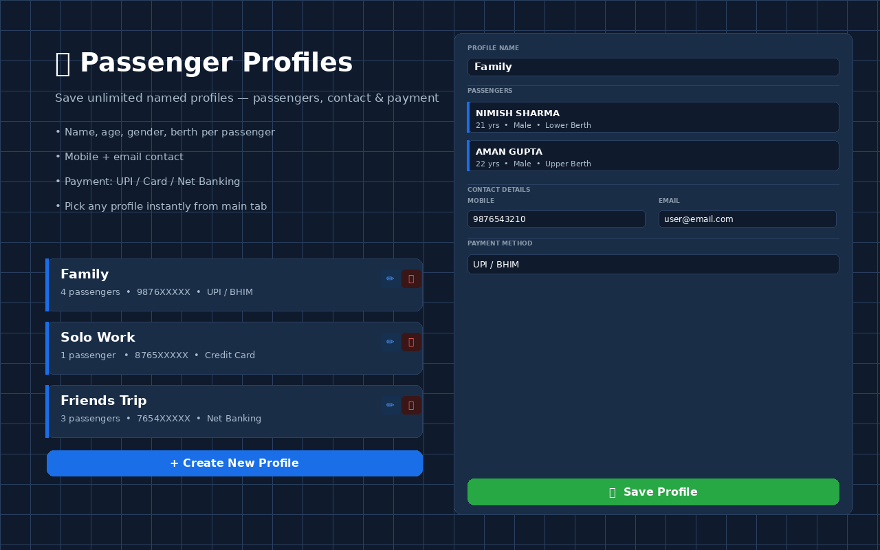 保存多个命名配置文件 - 每个配置文件都存储所有乘客(姓名、年龄、性别、泊位)、您的手机、电子邮件和首选支付方式(UPI、银行卡、网上银行)。