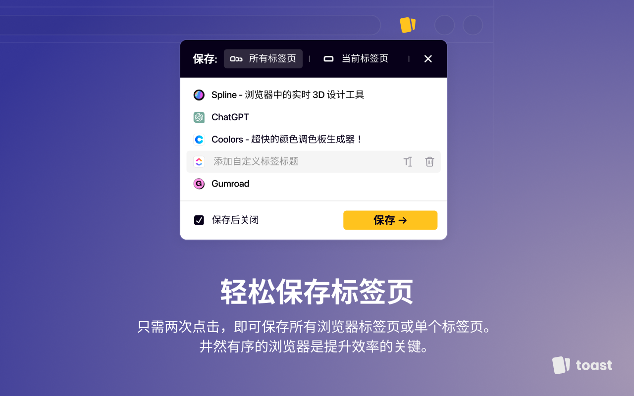 ⚡️ Toast Crust:全新交互方式,随时可用的两个按钮——保存当前标签页和保存所有标签页,让您无需中断工作即可即时保存标签页。