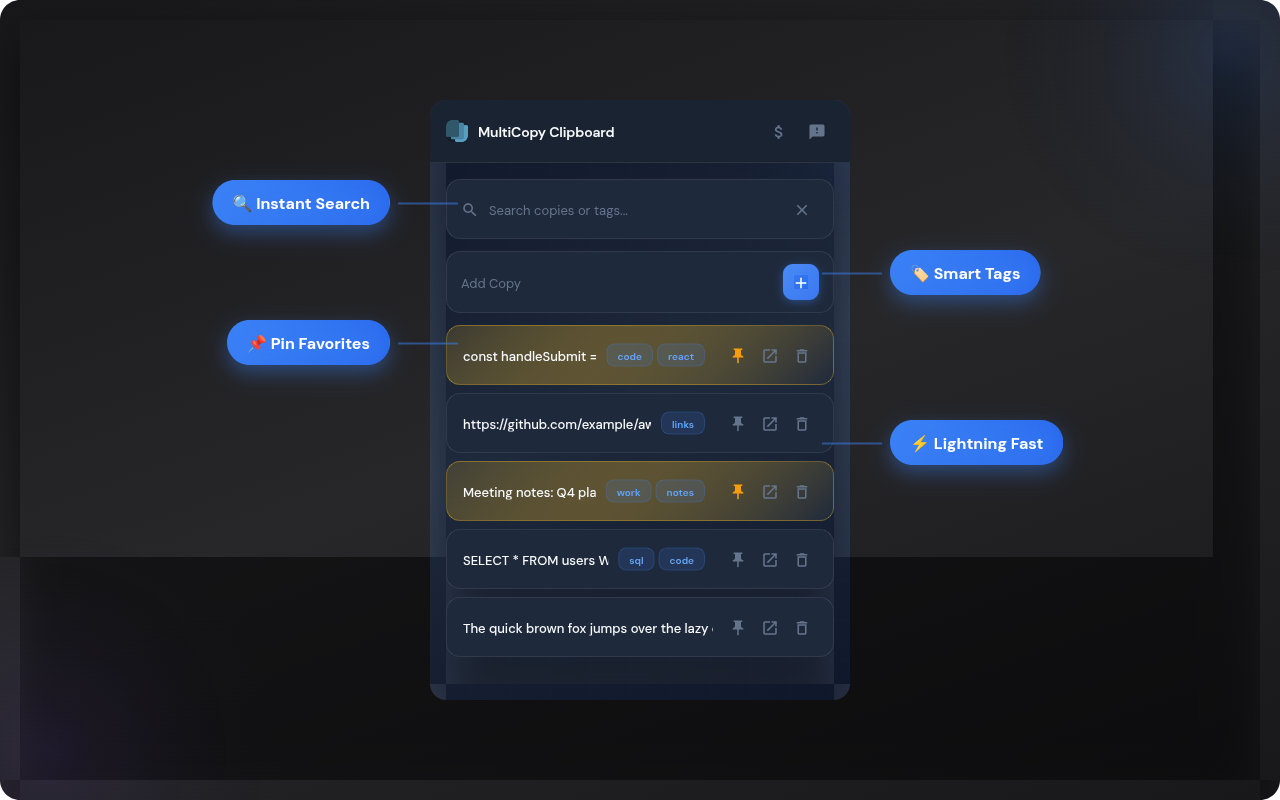 无论您是收集代码片段的开发人员、收集报价的研究人员,还是整天复制和粘贴的任何人,MultiCopy 都能确保您的所有文本安全、可搜索且可立即访问。
