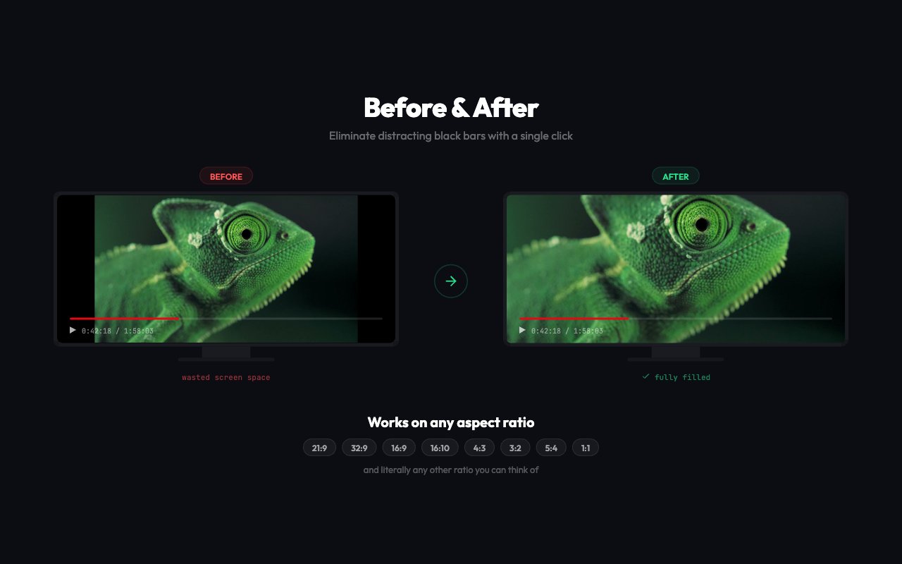 移除任何视频的黑边。在任何视频平台上,自动将视频适配全屏。