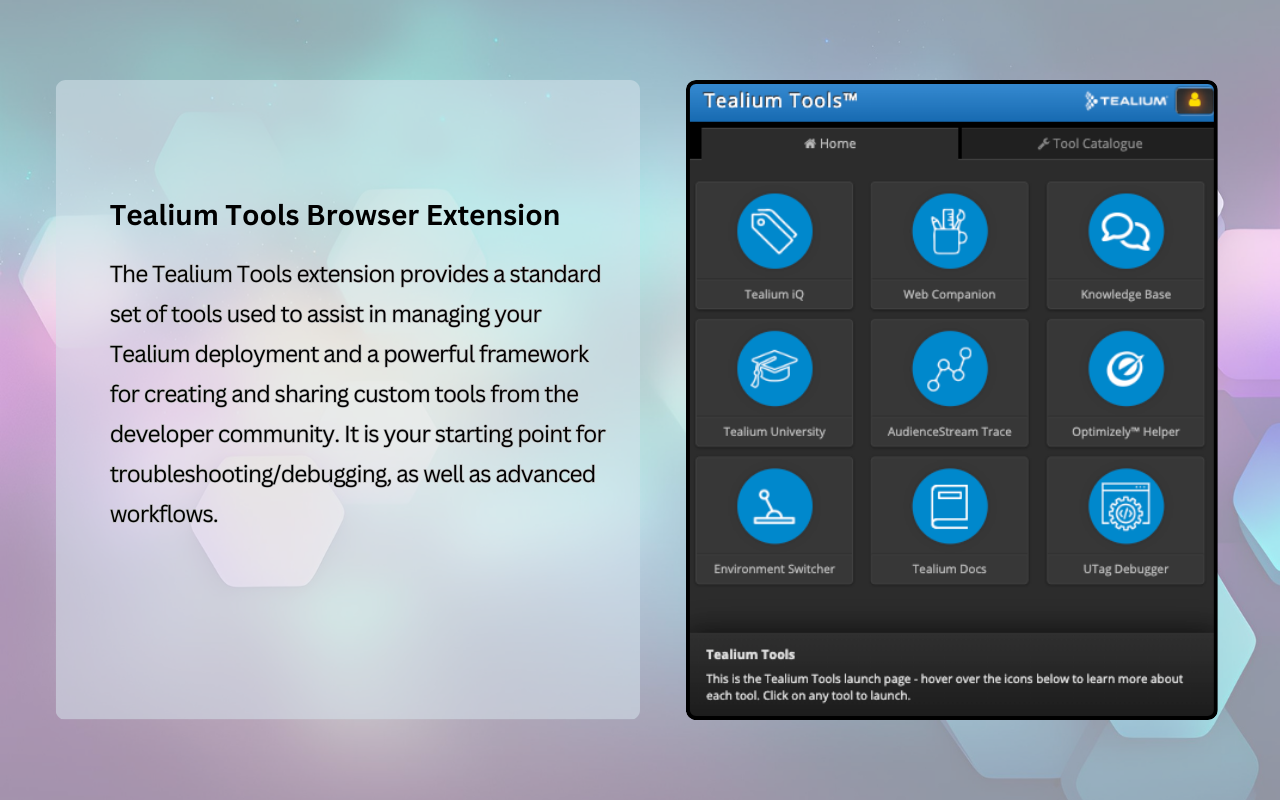 为 Tealium 生态系统构建复杂且丰富的应用程序。自定义工具允许您在当前页面上运行 JavaScript,类似于高级书签,使您能够收集数据并根据您的特定需求创建强大的定制工具。