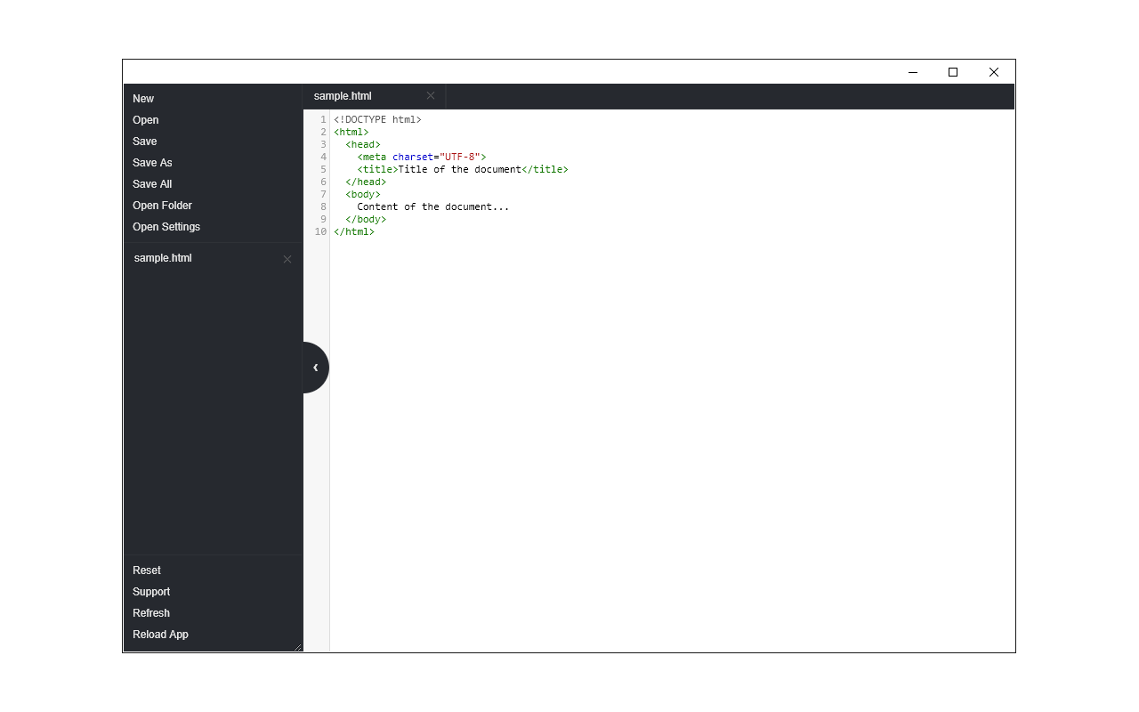该附加组件有大量可供调整的选项,并且构建在著名的 CodeMirror 开源 JavaScript 库 (https://codemirror.net/) 之上。第一次打开该附加组件后,您将在左侧看到一个侧边栏,在右侧看到一个空文本编辑器。左侧边栏包括文件 I/O 按钮。例如,用于打开文件或设置的按钮。还有一个右侧边栏,其中包含此应用程序的所有选项。