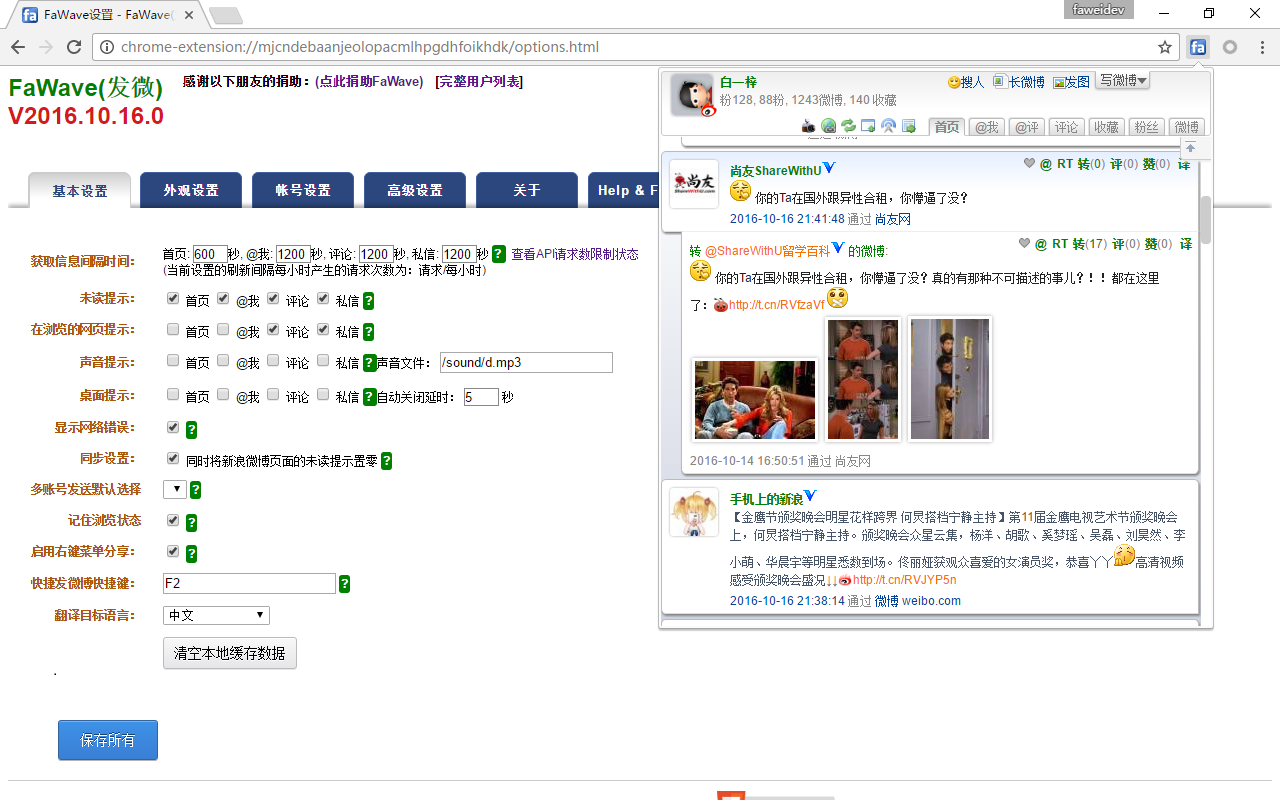 FaWave(发微),支持多微博的Chrome插件,各微博同时提示、无缝切换。有问题请找 @白一梓 反馈。