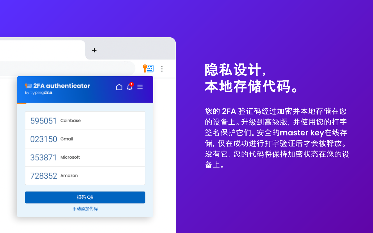您无需再使用手机进行身份验证。这个 2FA TOTP 身份验证器扩展程序可以直接在您的浏览器中生成双重验证代码,并可选择通过 TypingDNA 的基于 AI 的打字行为生物识别技术提供额外的安全层。