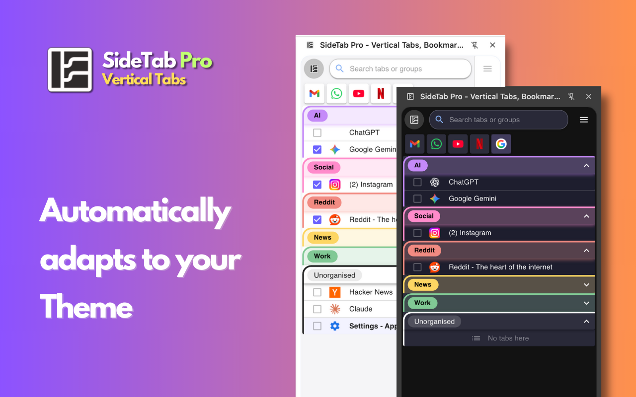 📑 侧面板中的垂直选项卡 – 轻松组织和导航您的选项卡。