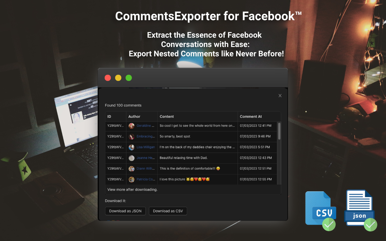 此扩展的主要功能是轻松地将 Facebook 文章中的评论导出为 JSON 或 CSV 文件格式。不再需要复制粘贴或手动组织注释 - 只需单击几下,导出的数据就会整齐地存储在您的计算机上。
