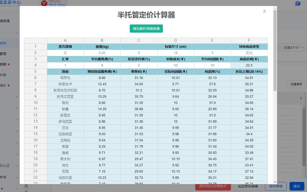 速卖通半托管产品定价计算器。可对已发布产品进行利润分析、发布产品时对将要发布的产品商品定价,可计算出每个国家的实际利润和折扣上限,并且可保存产品的定价数据,方便管理商品利润今后报活动时参考。