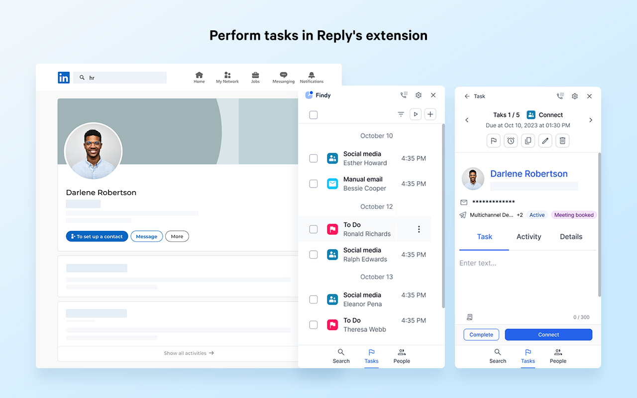 借助新的 Reply 的 Chrome 扩展程序,您可以搜索新的潜在客户,以便稍后参与自动外展活动,通过直接访问您的任务、Reply 和 CRM 之间的自动数据同步以及直接呼叫来提高您的工作效率。