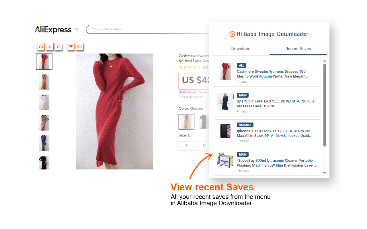 该工具可帮助您从阿里巴巴和速卖通等中国电子商务网站下载主要、变体和描述图像和视频