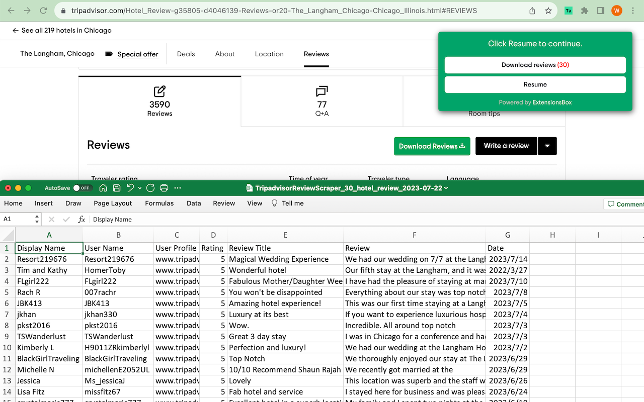 TripAdvisor 的评论抓取器是一个功能强大的浏览器扩展程序,允许用户从 TripAdvisor 的各个部分抓取和导出评论。通过将数据导出到方便的 CSV、JSON 或 XLSX (Excel) 文件的能力,用户可以根据自己的需求轻松分析和利用数据。