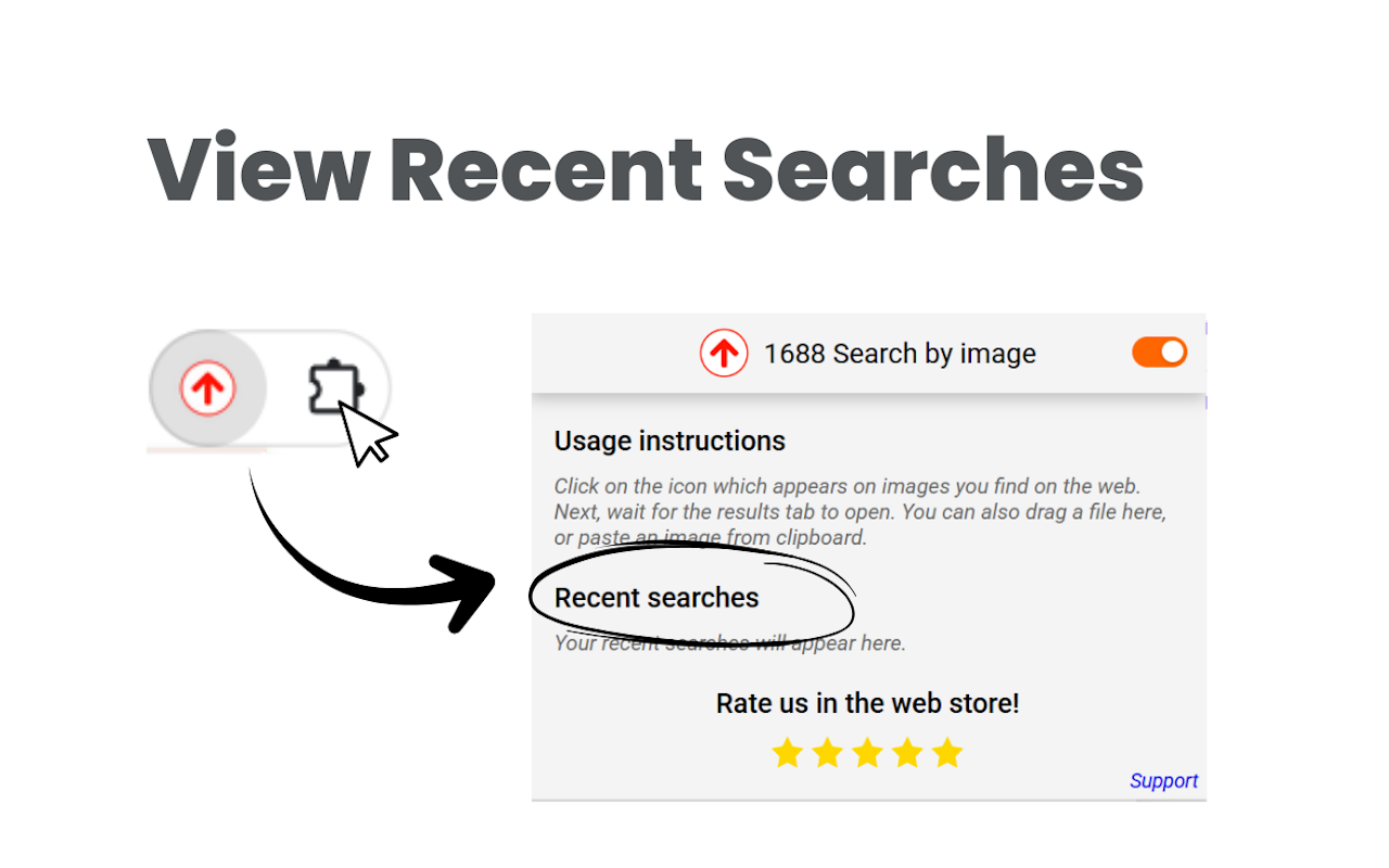 在弹出窗口中,您可以查看最近的搜索,以便随时快速重新访问它们。您还可以拖放图片,或从剪贴板粘贴图片(Ctrl + V),直接在阿里巴巴、1688或速卖通上搜索,无需手动上传文件。